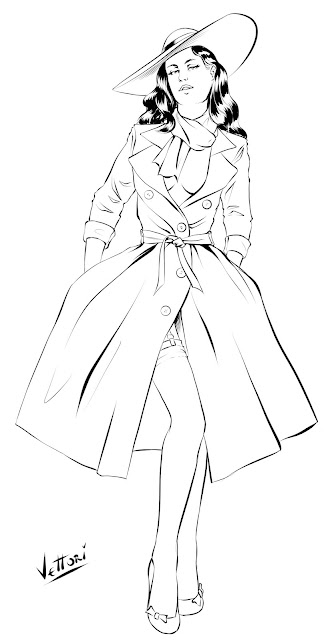 Fae, in her signature, 1930's style, big hat and mackintosh (but little else).