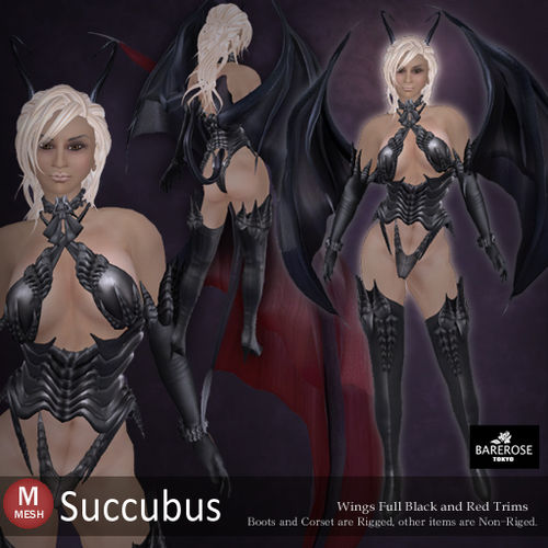 [[Image:BRSuccu.jpg|thumb|500px|Succubus Costume designed by [https://marketplace.secondlife.com/stores/1265 Bare Rose.]] | [[Image:BRSuccu.jpg|thumb|500px|Succubus Costume designed by [https://marketplace.secondlife.com/stores/1265 Bare Rose.]]] | ||